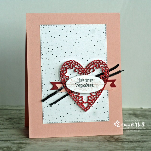 I have a box of goodies from the Occasions catalog and Sale-a-Bration, which starts tomorrow, that I’ve been dying to tear into but have been too preoccupied with the holidays. I thought the circle image in the sketch would be perfect for one of the new heart dies in the Occasions catalog so that is the direction I took.