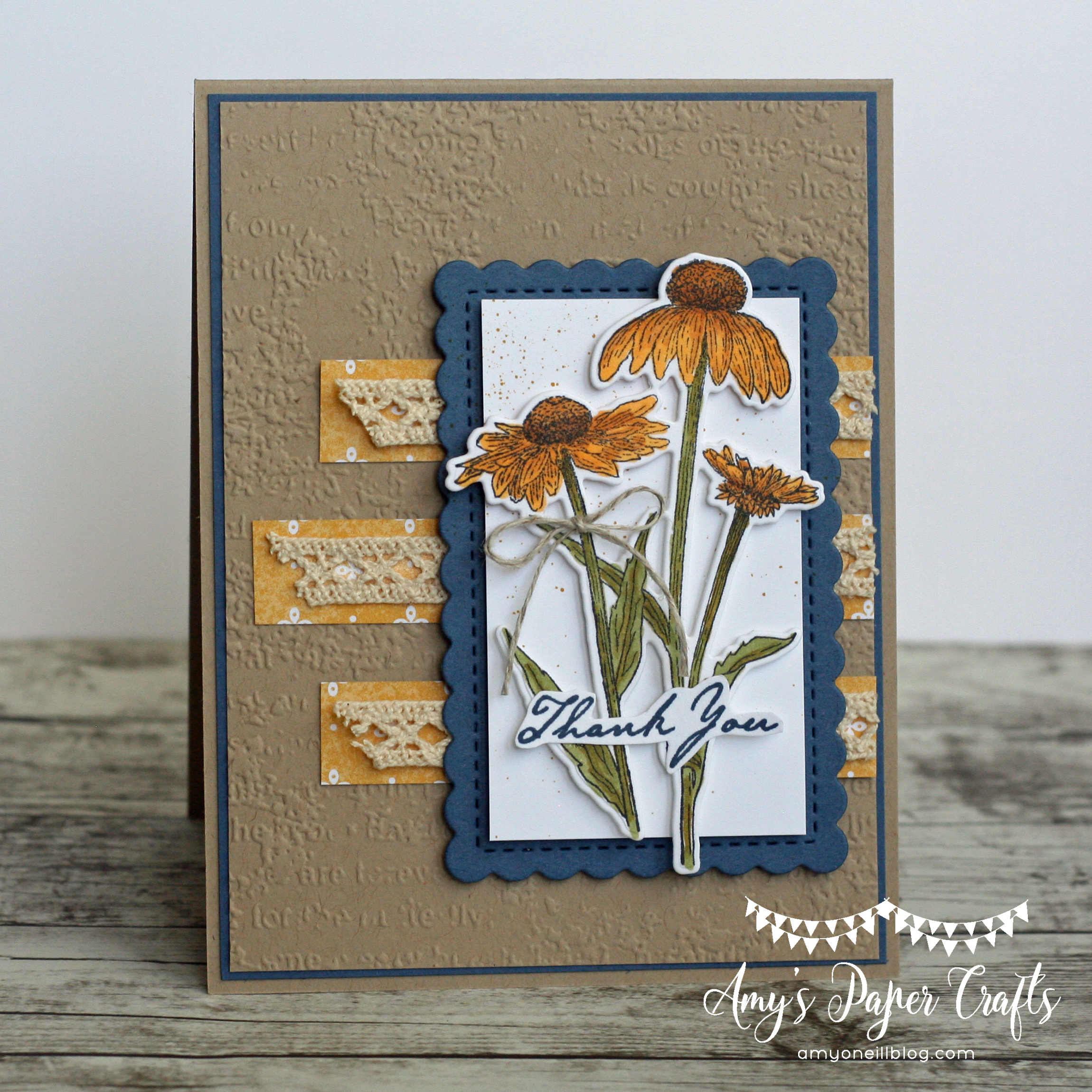 I stamped the images and cut them out with my paper snips. I then arranged them on a piece of card stock that was cut with the Stitched Greenery die. A Cajun Craze scalloped edge was cut using a die from the Scalloped Contours dies. The sentiment is from the Nature’s Harvest stamp set and was embossed with white embossing powder. The dsp on the card base is from the Harvest Meadow collection.