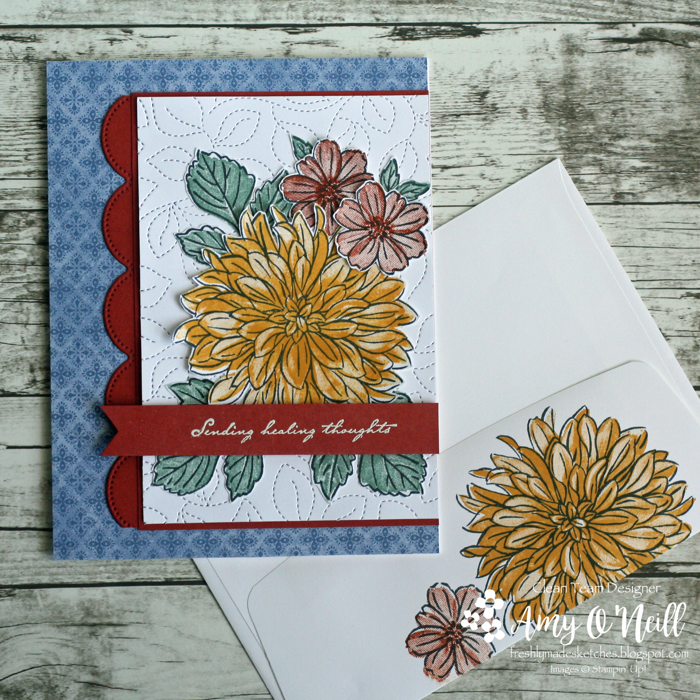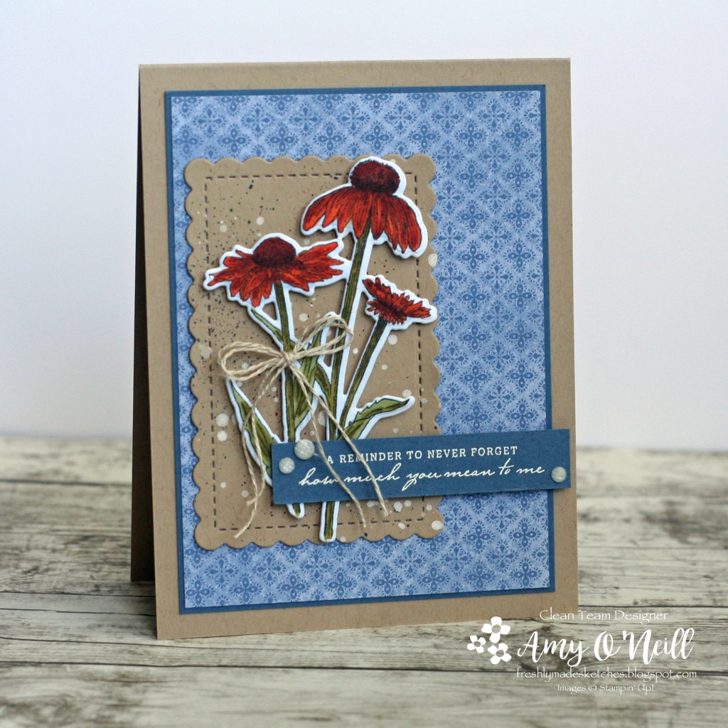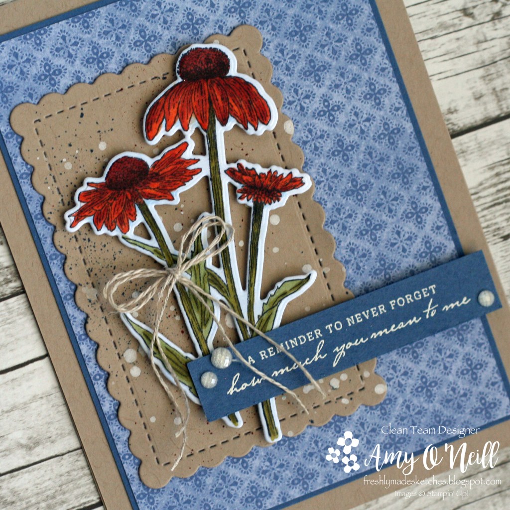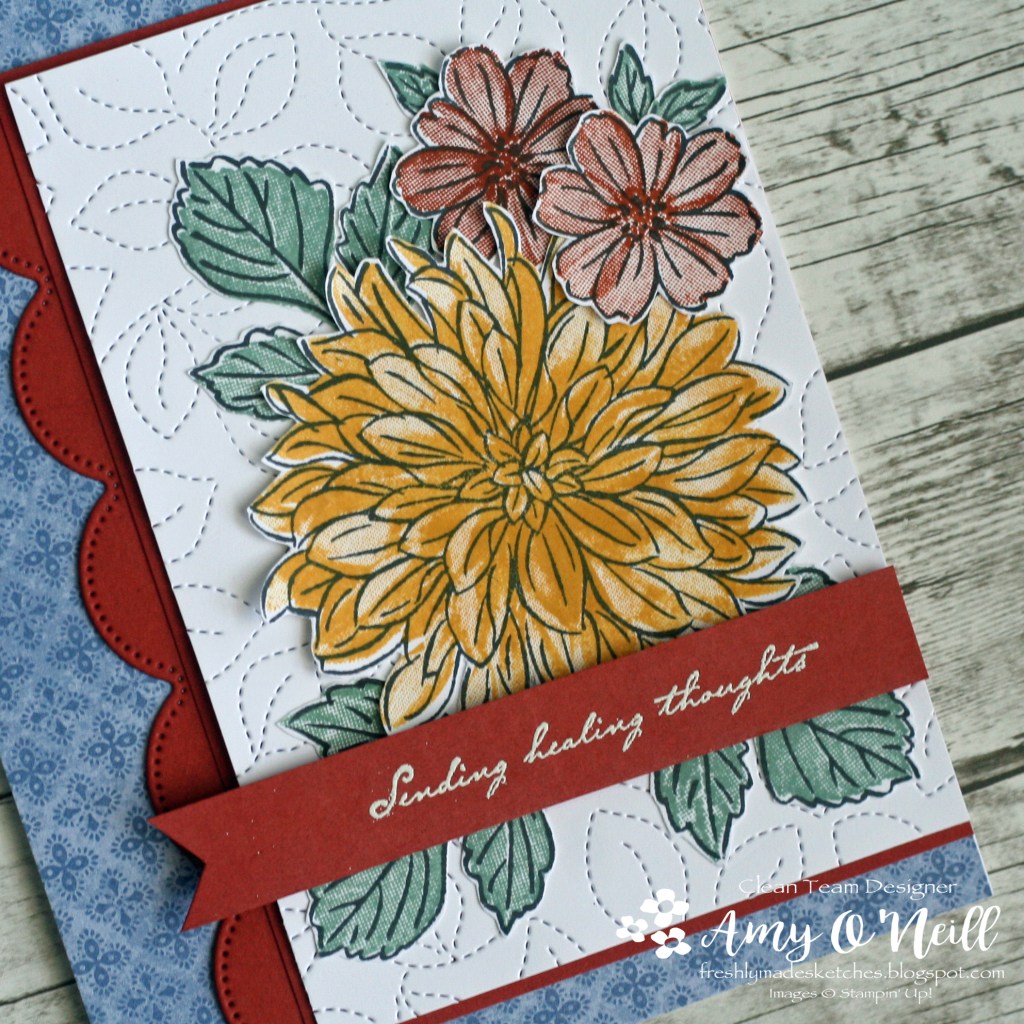 I thought the focal panel on this sketch would be big enough to showcase the Delicate Dahlias stamp set. It is one of the current Sale-a-Bration offerings, so if you don’t have it yet you’d better hurry and get it (for free!).