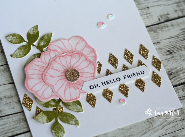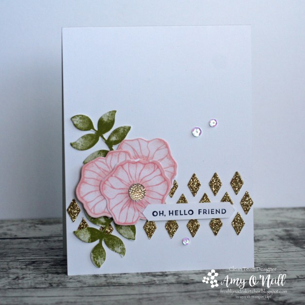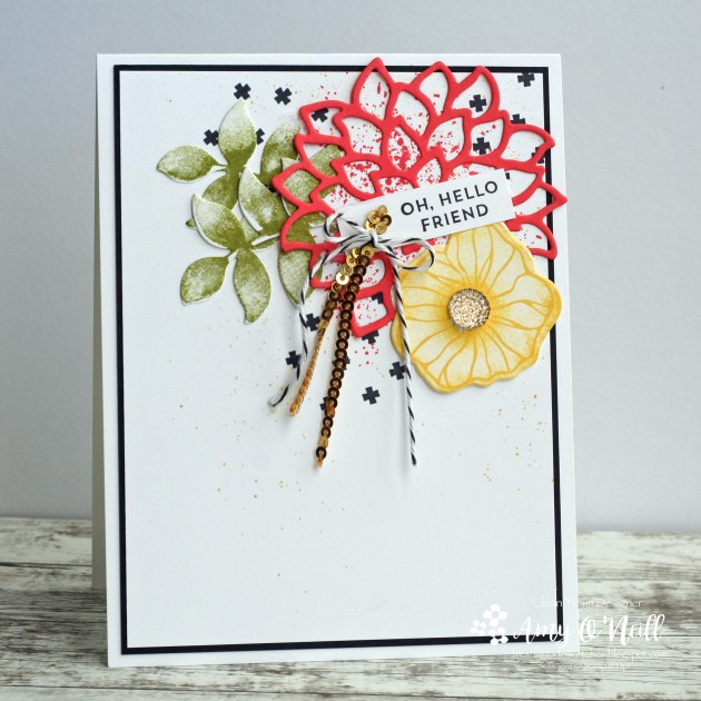 I love a good collage style sketch and this one is fun because all of the shapes are different and they’re large. I started out by grabbing a die-cut flower from the May Flowers Framelits collection that I’ve had on my desk for a long time. I didn’t use it on a project I made months ago and it has been patiently sitting on my desk waiting for a forever home. I thought it would be great for the pink circle part of the sketch. Then I thought some leaves would be great for the green triangle image, which spurred me to grab the Eclectic Layers Thinlits. When I stamped the leaves with the coordinating Oh So Eclectic stamp set, I thought I might as well use one of the flowers from that stamp set since it was out (yeah — I’m lazy like that). And there you go — I had my three shapes for the collage.