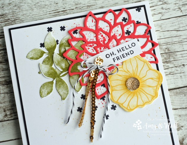 I stamped some splatters from Touches of Texture and some black + symbols from the Oh So Eclectic set in the background. A bit of black baker’s twine and gold sequin trim were added as well.