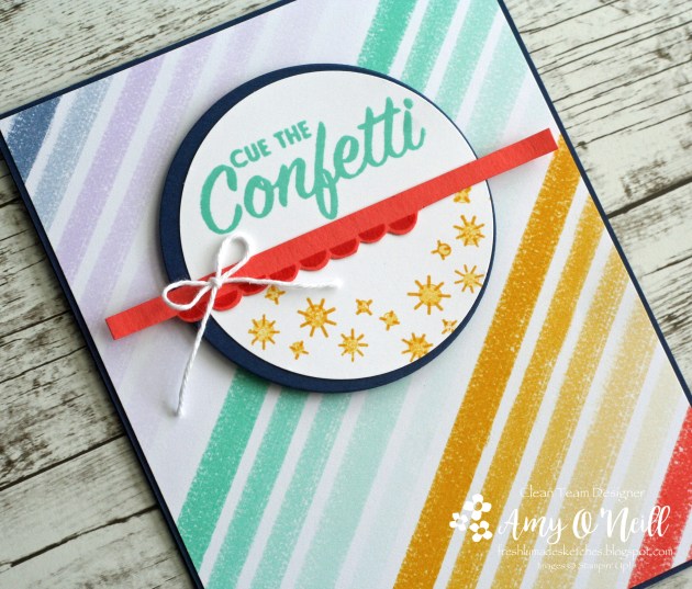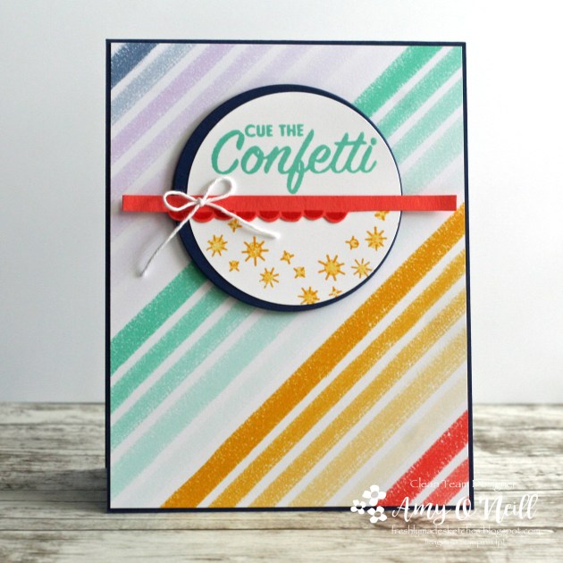 The designer series paper from the Playing with Patterns pack is really the star of the show on this card. I love the fun colors and the diagonal stripes. I stamped the sentiment and cut it out with a circle die. A slightly larger circle was cut out of Night of Navy card stock as well. The scallops were stamped with Calypso Coral ink on Calypso Coral card stock and cut out with my paper snips. I then stamped the sequins/confetti with Crushed Curry ink.