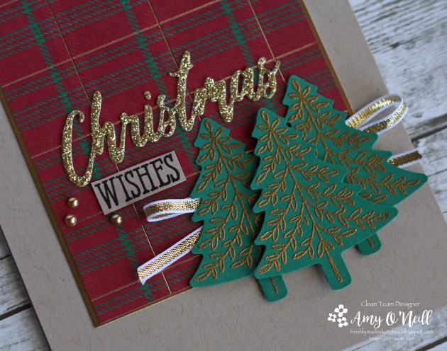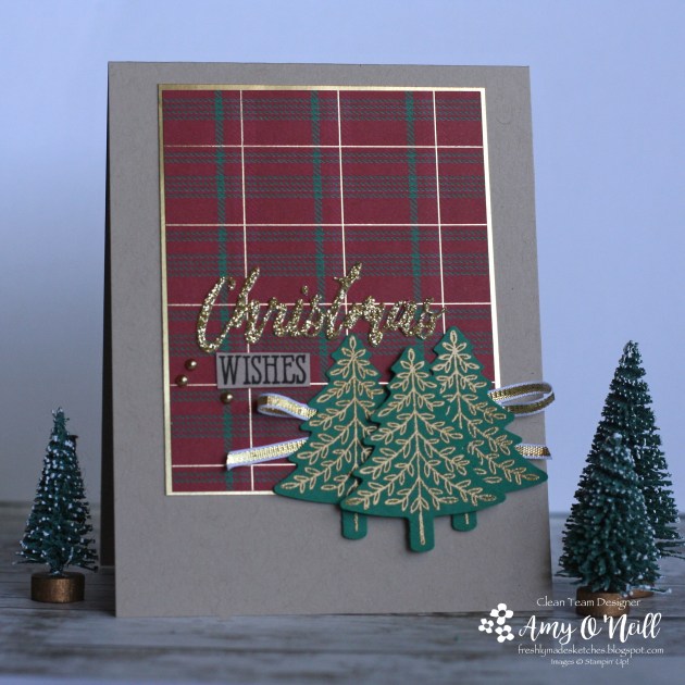 I started the card with a piece of dsp from the Wrapped in Plaid collection. I then stamped the trees with Versamark ink and embossed them with gold embossing powder. They were punched out with the coordinating Pine Tree punch.
