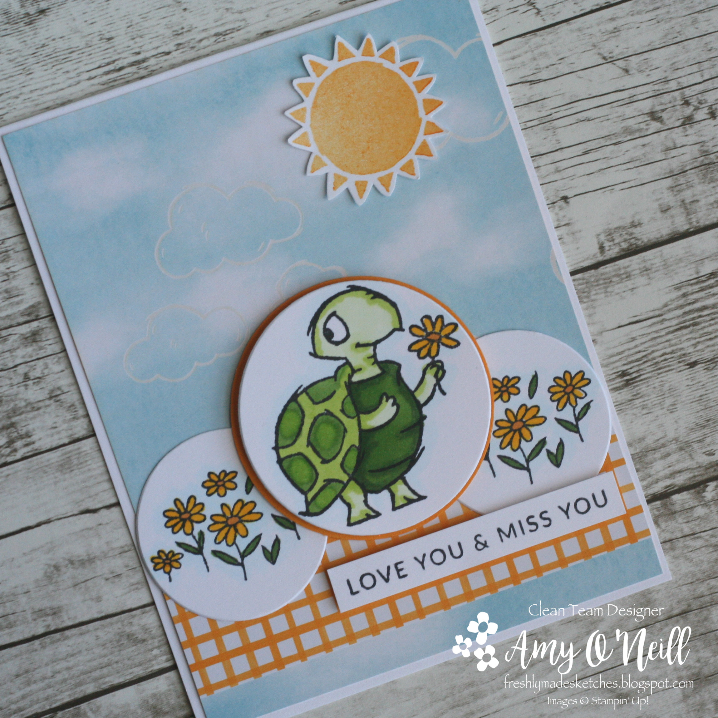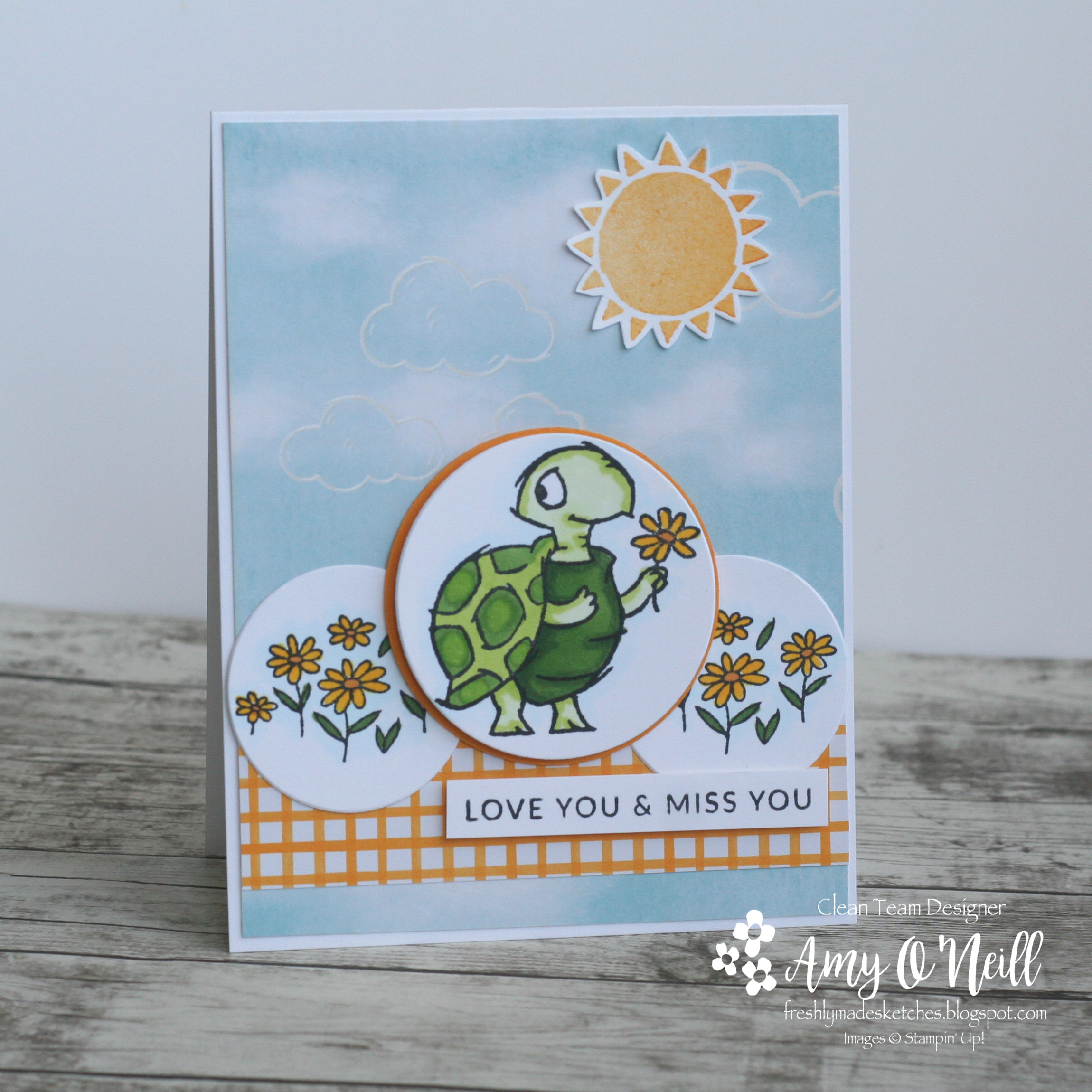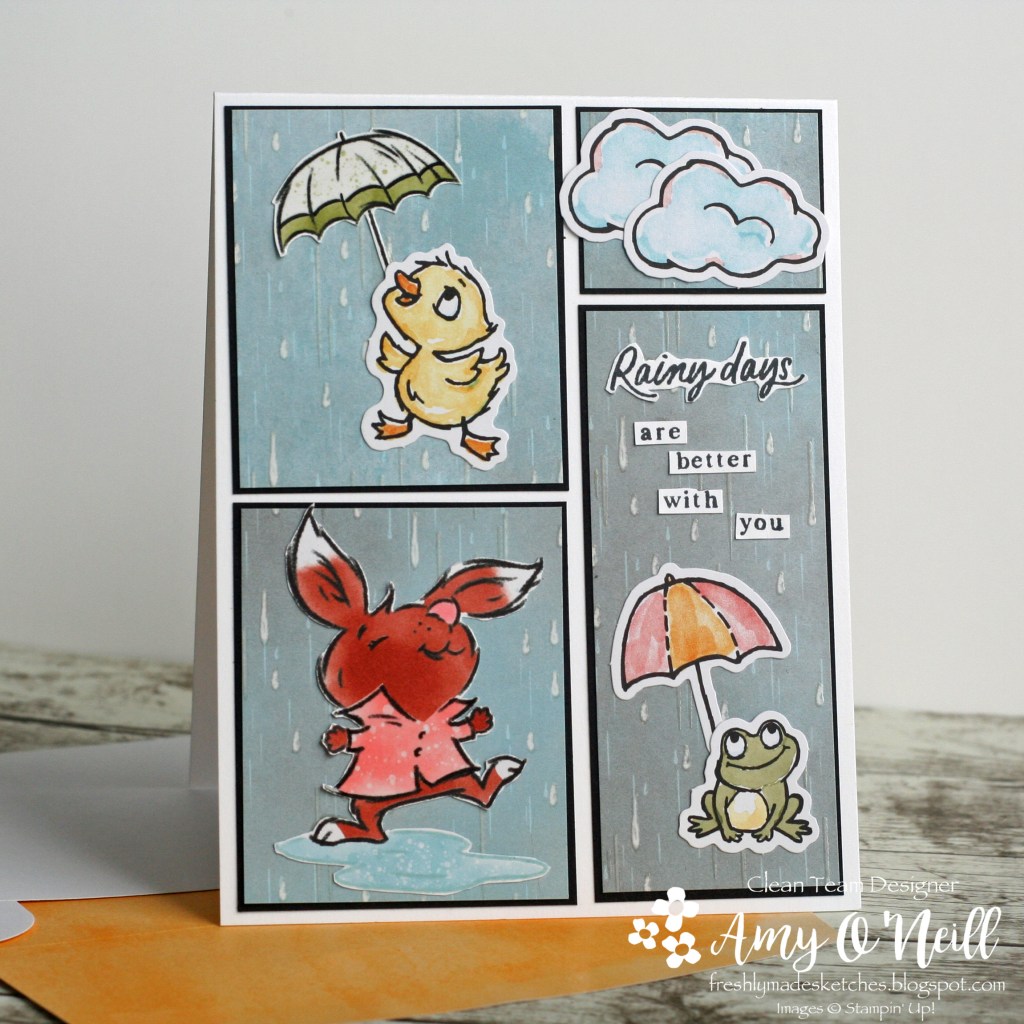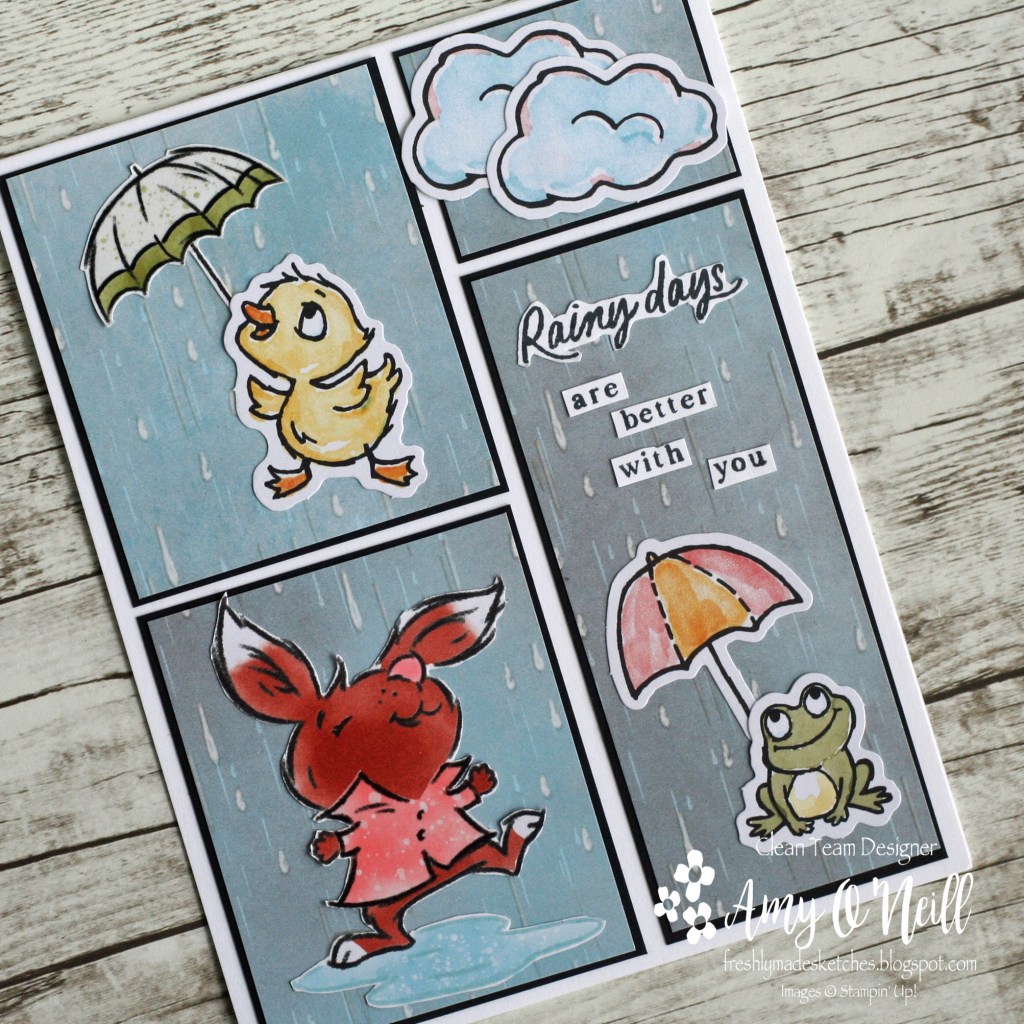 When I saw this sketch, the little critters from the Playing in the Rain stamp set came to mind as I thought I could fit different images in the four panels of the sketch. And then I thought I could make a card for my daughter who loves rainy days.