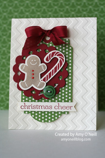 Embellishments: Holiday Collection Framelits, 1″ Circle Punch, Scallop Edge Border punch, Polka Dot embossing folder, Lucky Limeade Baker’s Twine, Bitty Buttons, Rhinestone Basic Jewels