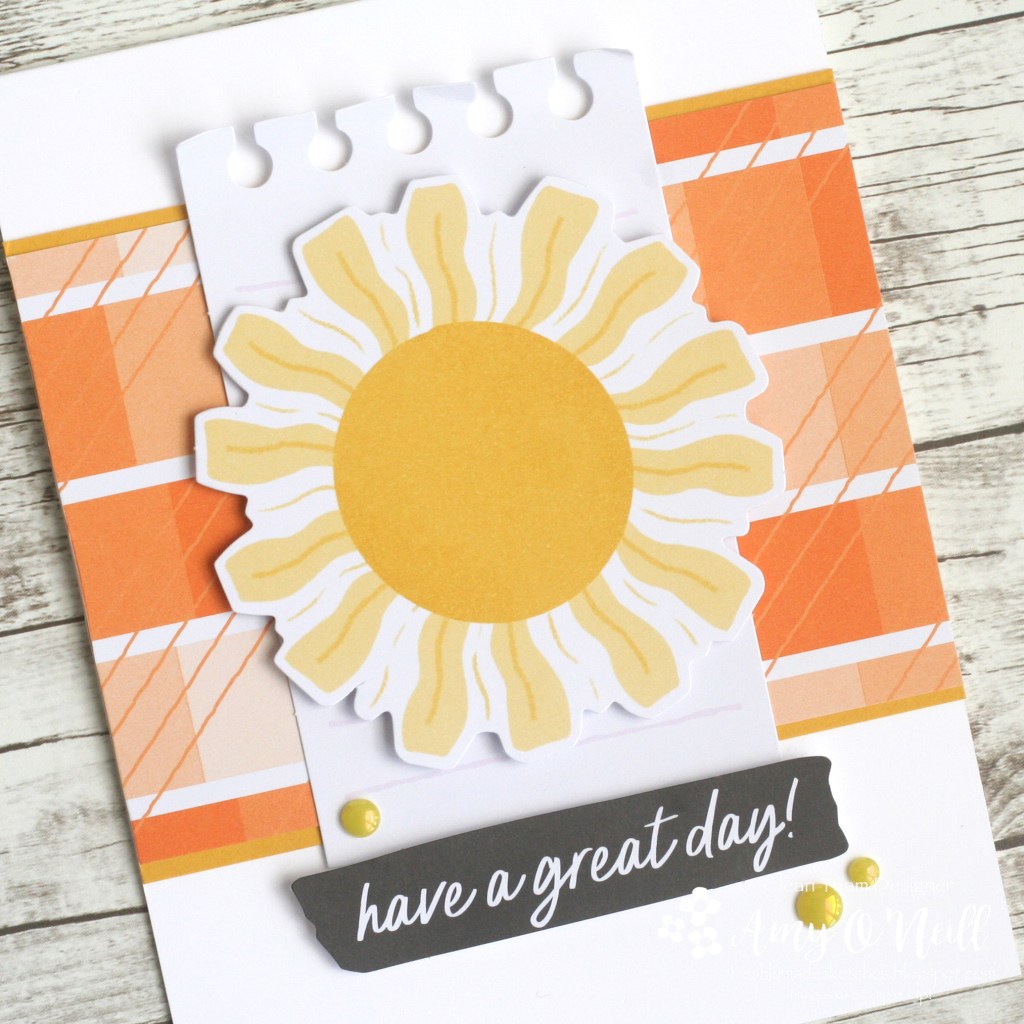 I started by cutting one of the card bases down to fit onto a white card base. The cute little notebook paper die-cut, the sunshine die-cut, and the sentiment die-cut are all included in the kit, as well. I added some In-Color Flat Pearls as embellishments, and that was that. Easy peasy.