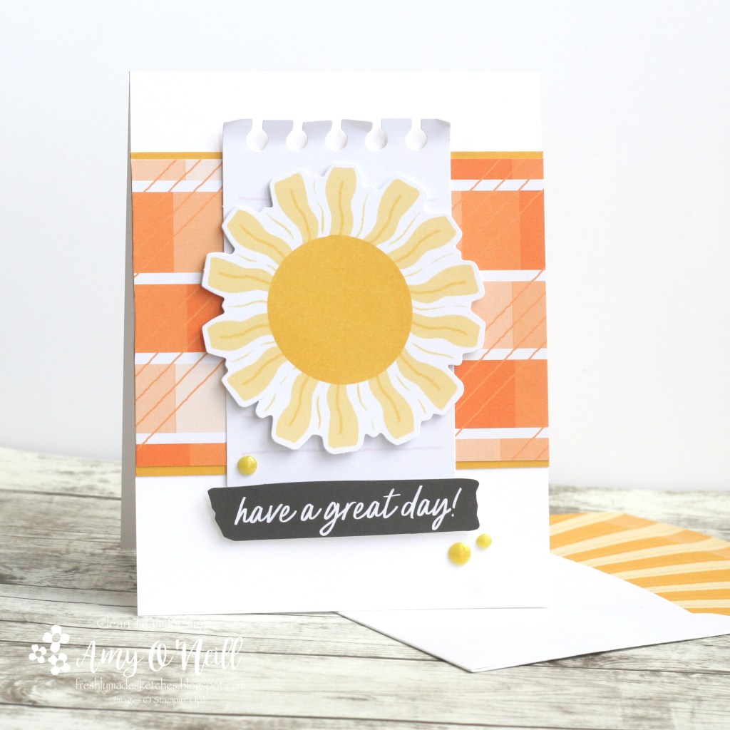 There’s a new kit available and it’s called the Share a Smile Kit. It has some sunny and happy card bases and envelopes, as well as some really cute die-cut images. I thought the kit would work well with the sketch.