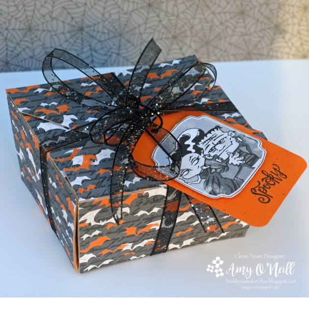 I also made some little 3″ x 3″ cards to put in the boxes. I’m not sure why my camera changed the color of the card, as it is exactly the same as the sheet of dsp on which the projects are sitting. I included some some square tubes that I had on hand but can’t remember where I got them and filled them with peanut M&Ms. Both the card and tag were made using the Spooktacular Bash stamp set and coordinating Ornate Frames dies.