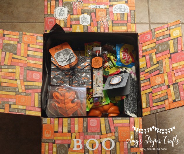 I used a couple of Monster Bash dsp sheets to decorate the inside of the box as well, where I put some soft, warm socks, decorations for her door and room, some of her favorite Halloween candy, and some pictures of them when they were little in their Halloween costumes.