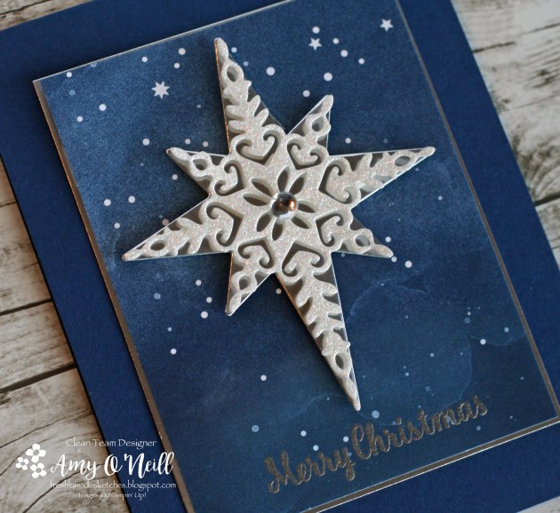 While trying to decide on a starry background for the big focal star, I remembered the baby-themed dsp set, Twinkle Twinkle. I thought the dark blue paper would be perfect to reflect a starry Christmas night.