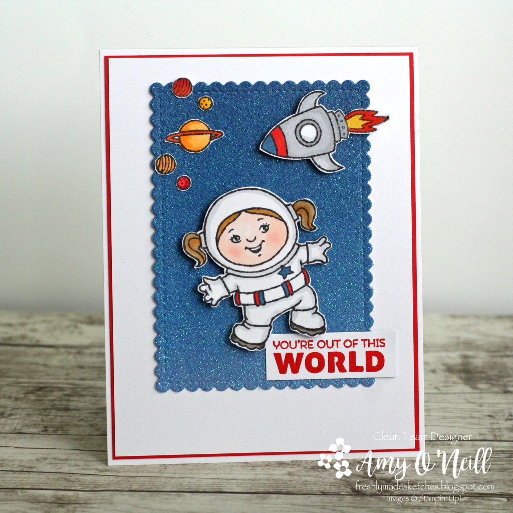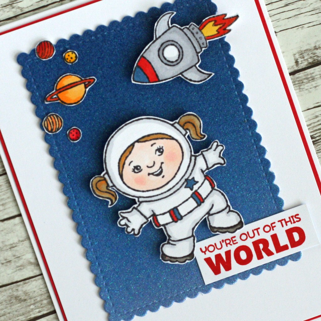 Normally I might think this is a challenging sketch. What to do with those little circles? But I recently acquired a new stamp set, Stellar Birthday, that I knew my older two kids would love as they are big space nerds. And this set has little planets that I thought would be perfect for the little circles. This card is for my daughter, who would love to go on a mission to Mars. In fact, that is what she wrote her college application essay about. Not me — I think I’ll keep my feet firmly on Earth.