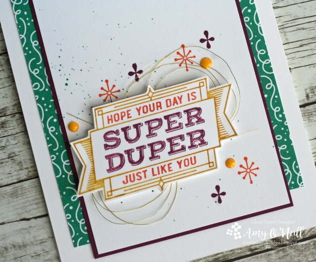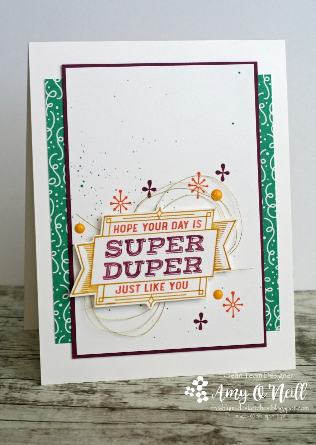 When I made the sketch a few weeks ago, I had a specific stamp set in mind. However, since I am not very good at predicting which stamp sets will be retired and which will stay, I didn’t guess correctly on this one. So I picked another stamp set, Super Duper, that is retiring. I love the fun, graphic sentiments in this set.