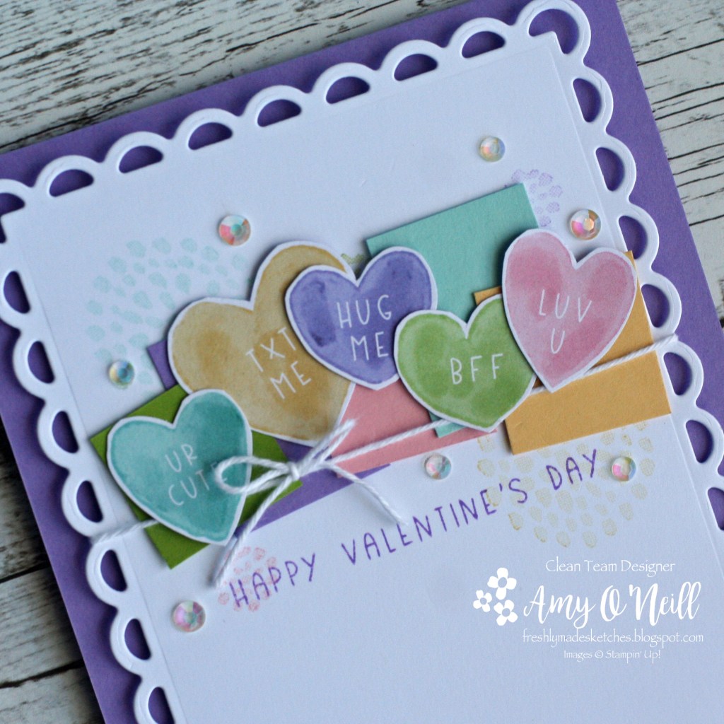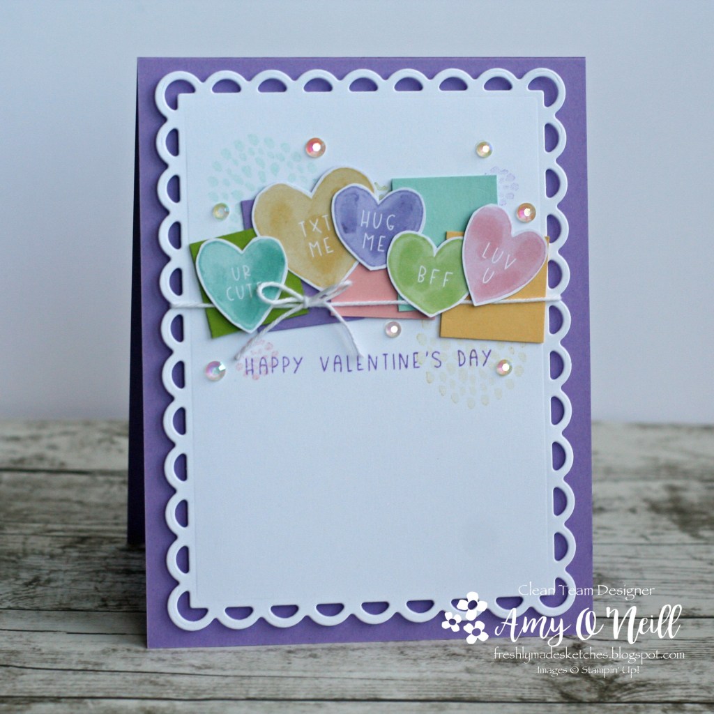 I started by cutting out some squares and rectangles from various colors of card stock that are in the Sweet Talk dsp. I then cut out some of the conversation hearts from one of the sheets of dsp and arranged them all on a piece of white card stock which was cut out using a die from the Scalloped Contours dies. I stamped off some circle splats from the coordinating stamp set before adhering the focal images.