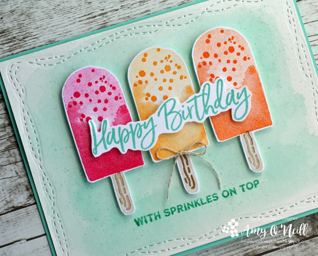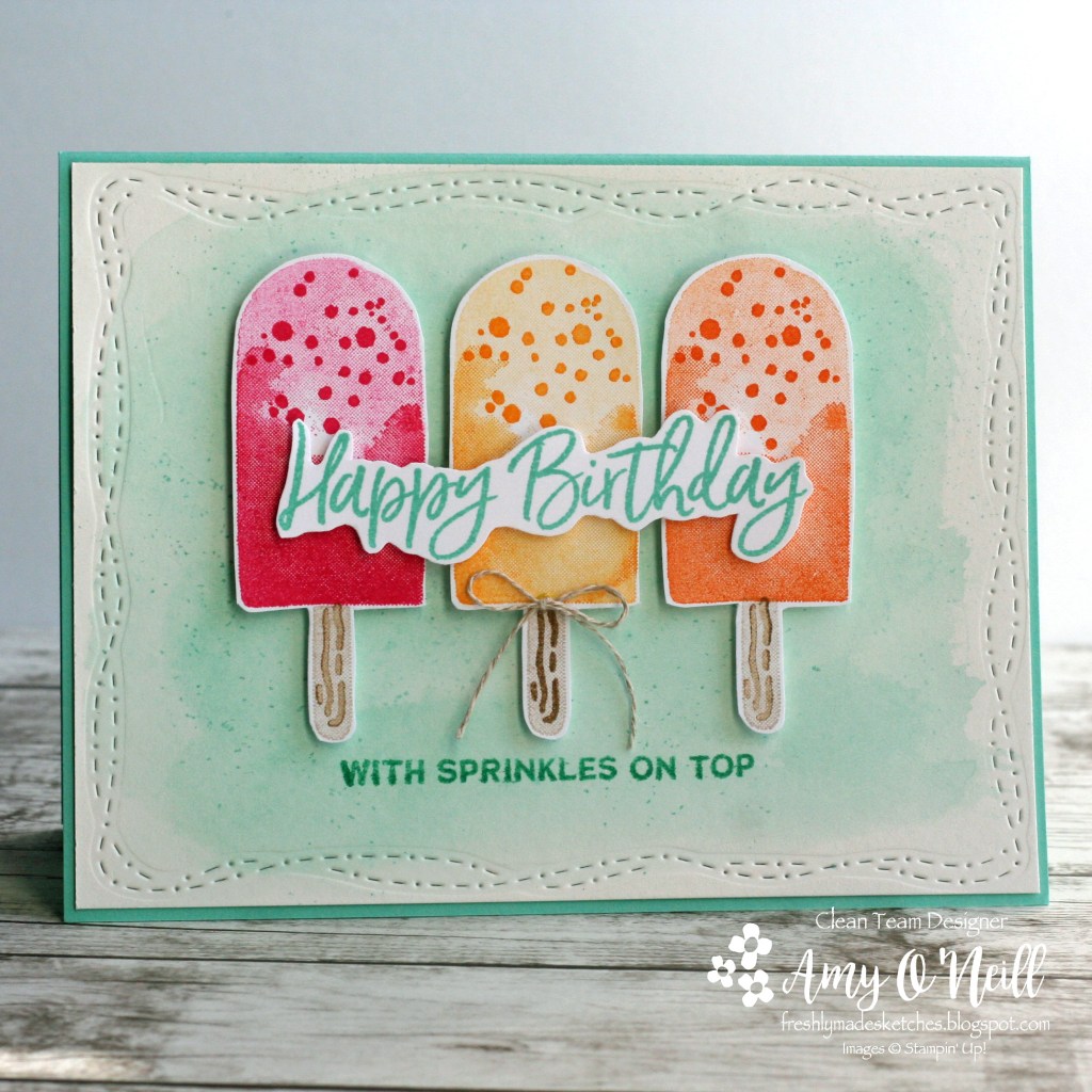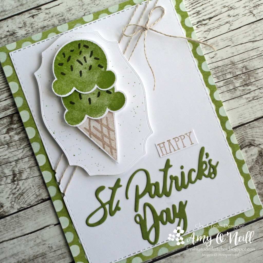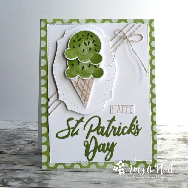 I used some of the coordinating Ice Cream Corner dsp to punch out the cones and scoops of ice cream, so there really wasn’t much stamping involved with this card. I did stamp the sprinkles and dots with some stamped off inks and a splatter of some white acrylic paint. The sentiment from the set was embossed with white embossing powder.