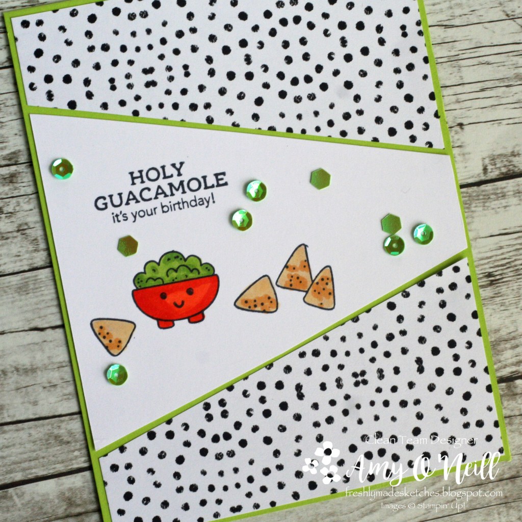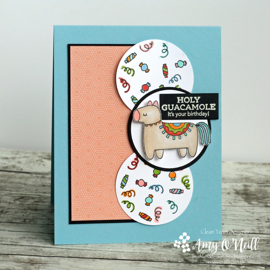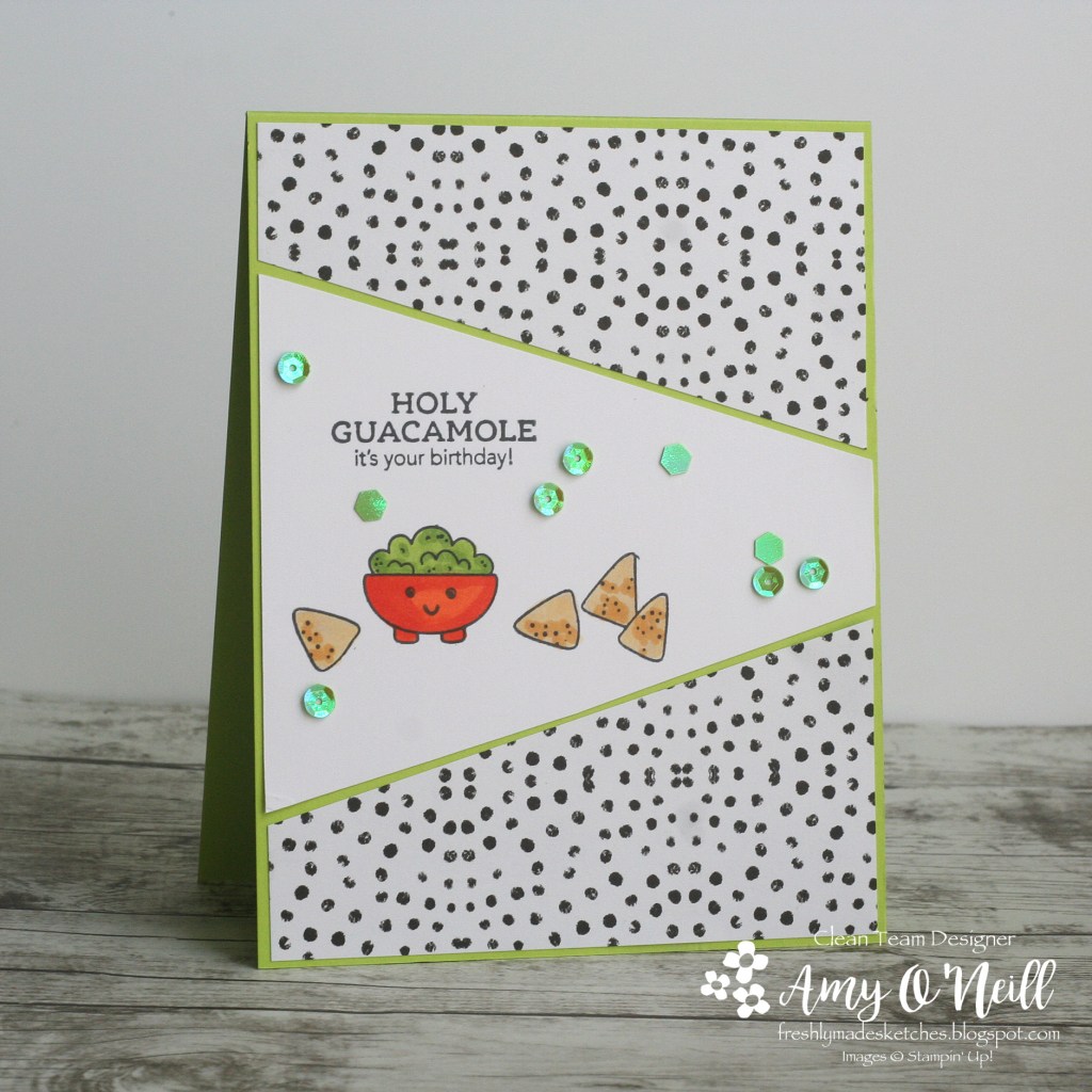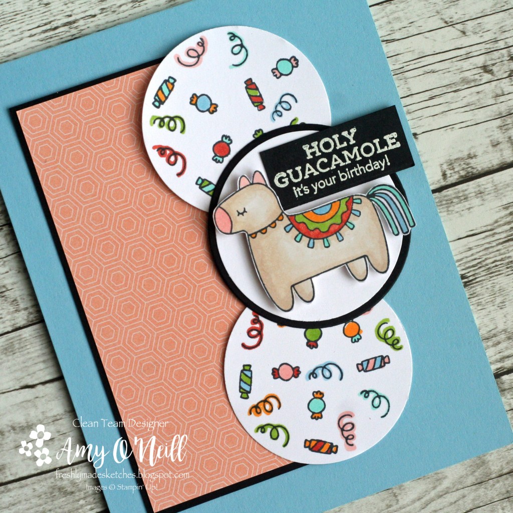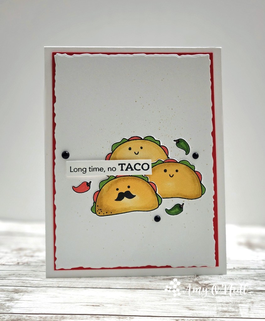 When I saw those three circles, I thought of tacos. Truth be told, I’m often thinking of tacos and there are lots of awesome places to get tacos here in Texas. And in honor of National Taco Day (Yes, that’s really a thing!) which is today, I thought the cute tacos in the Taco Fiesta stamp set would work well with the sketch and the holiday.