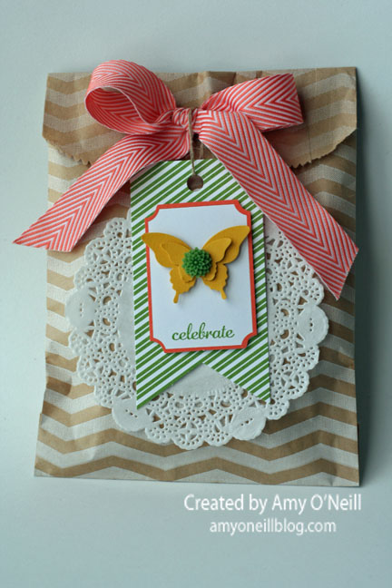 This first project is a cute little Tag a Bag Gift Bag that was made into a gusseted sack and decorated with the Tag a Bag Accessory Kit and the Tag It stamp set. I love the little clothes pins that come in the accessory kit.