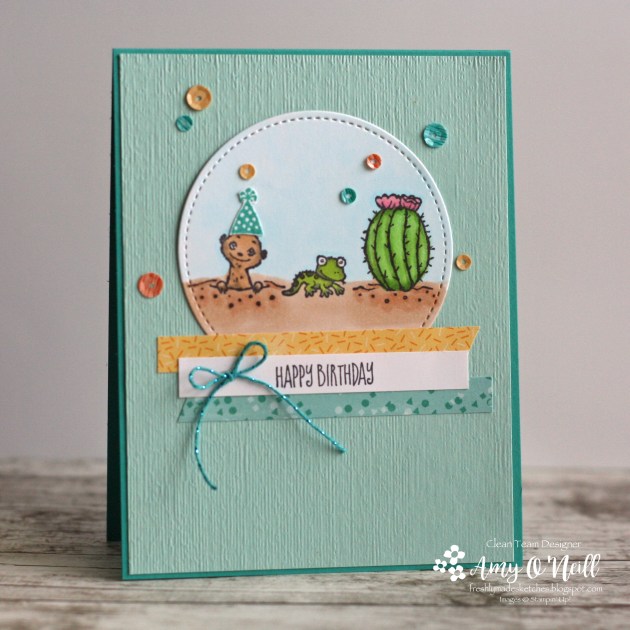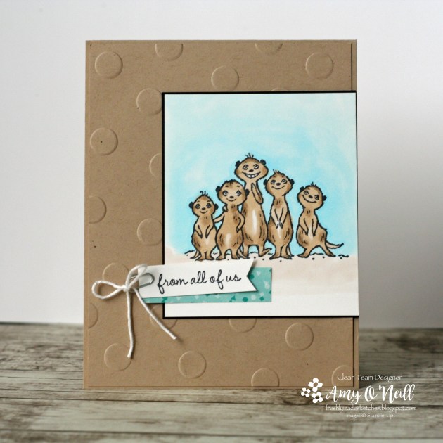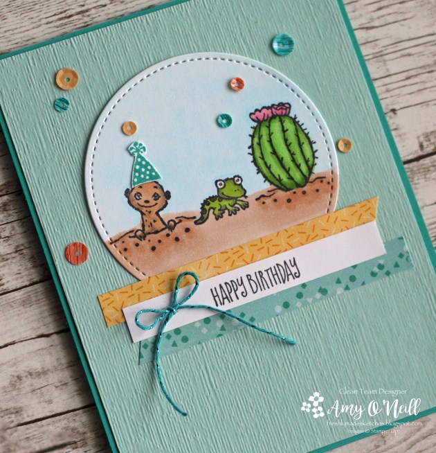 I thought I should stock up on some birthday cards because my stash has taken a big hit lately. I thought the cute little meerkats would work well with the partial circle in the sketch, so I went with that Sale-a-Bration stamp set.
