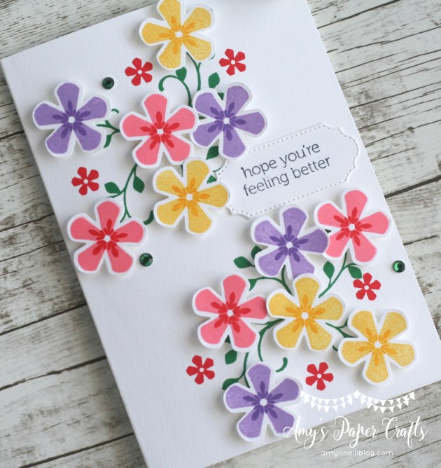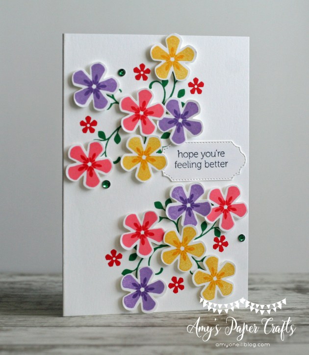 My daughters have been sick this past week, and with all of the craziness surrounding the Corona Virus around the world, it has been an especially bad time to be sick. I sent a package to my daughter who is at school out of state, and wanted to include a card for her. I thought she could use some bright, cheerful colors so I pulled out the Thoughtul Blooms stamp set, which is a Sale-a-Bration offering and stamped away. I love that there is a coordinating punch for this set!
