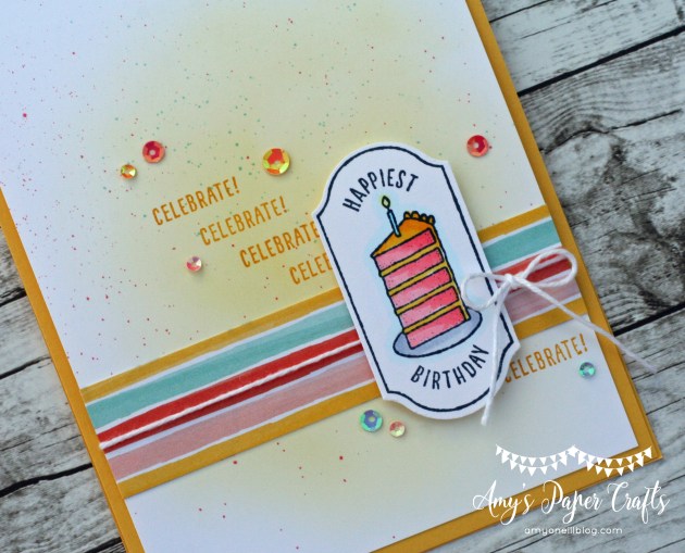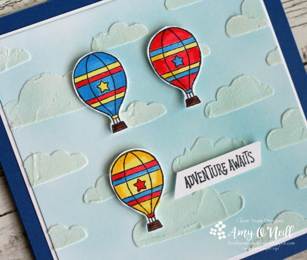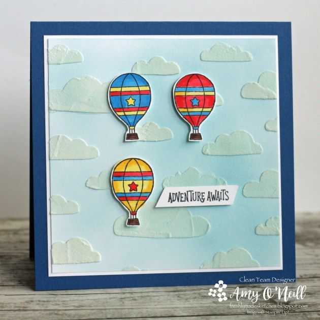 I hadn’t made a square card in a while, so it was fun to do something different. I still had the Time for Tags hostess stamp set on my desk from the last card I made, and there is a cute hot air balloon image on one of the tags that I thought would work perfectly with the sketch.