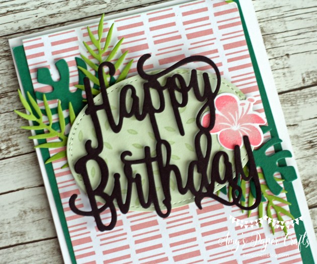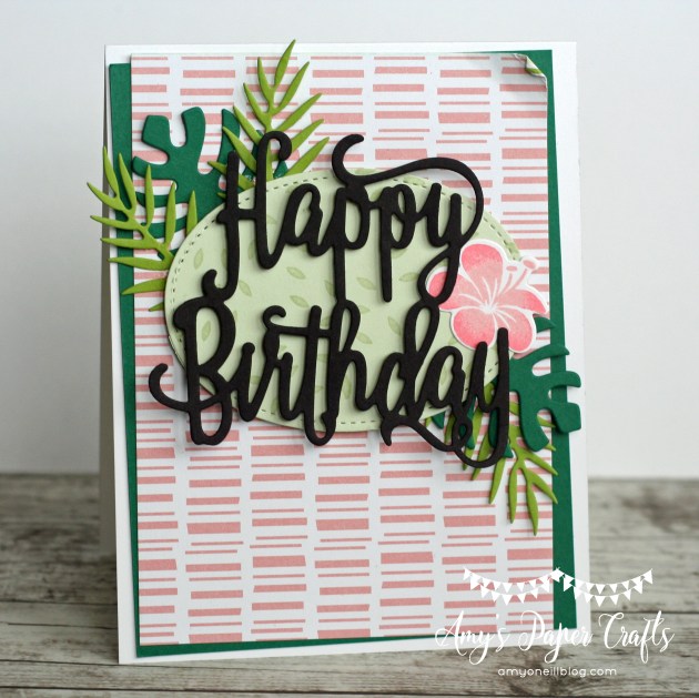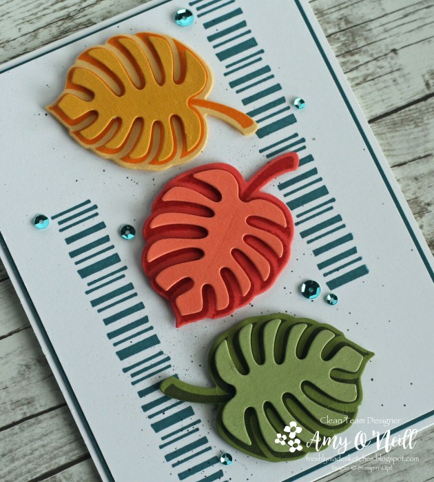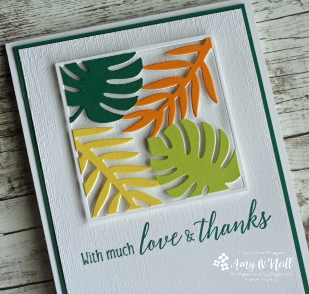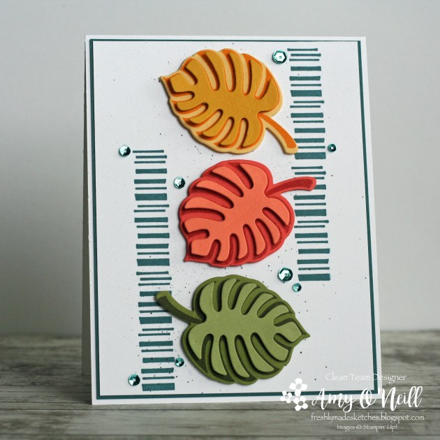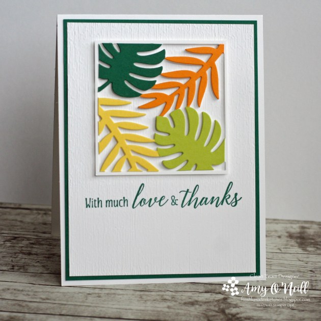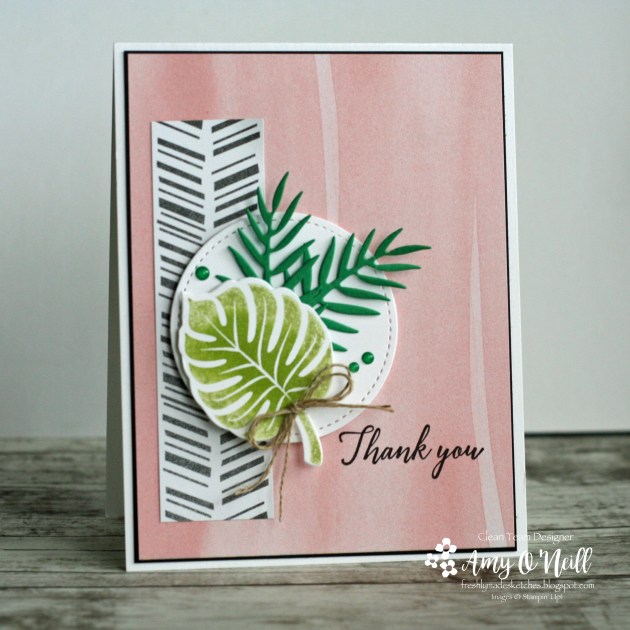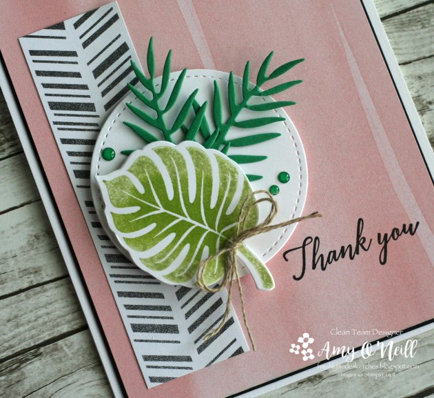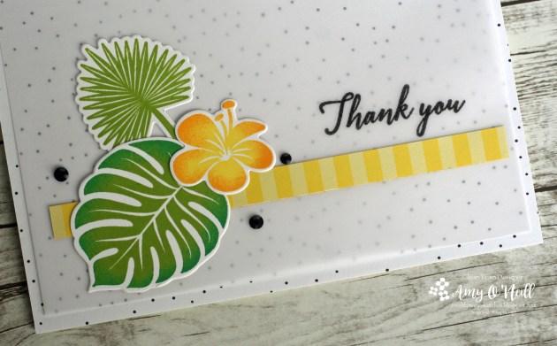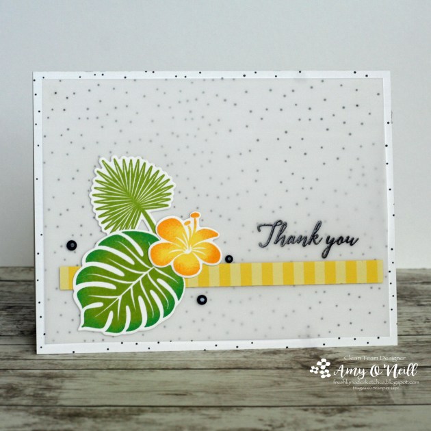 This sketch had me stumped for a while. We’ve been traveling a lot and have had so much going on the past couple of months that I haven’t been stamping very much. I feel rusty. I have a few new stamp sets, and I really wanted to use them but I couldn’t figure out how to make them work with this sketch. So I turned to an old favorite, Tropical Chic.