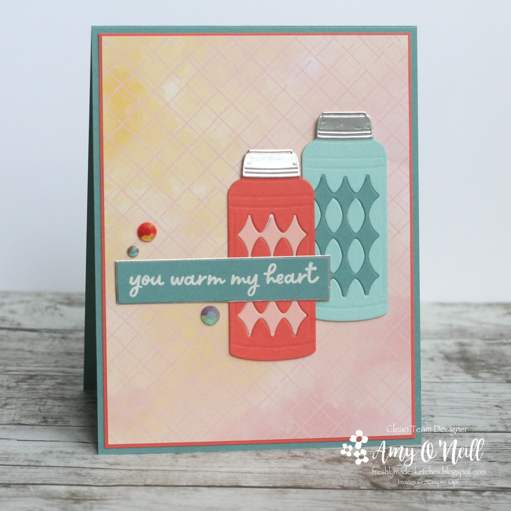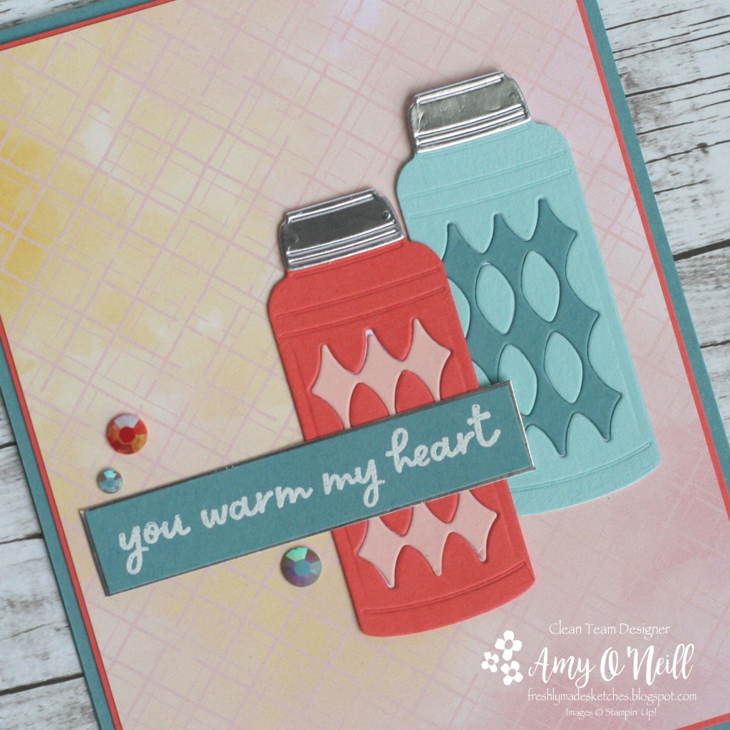 I die-cut the thermoses from Calypso Coral, Petal Pink, Pool Party, and Lost Lagoon card stock. I also used some silver foil paper for the tops of the thermoses. The sentiment is from the coordinating Warmest Heart stamp set, and the dsp background is from the Hello Irresistible collection.