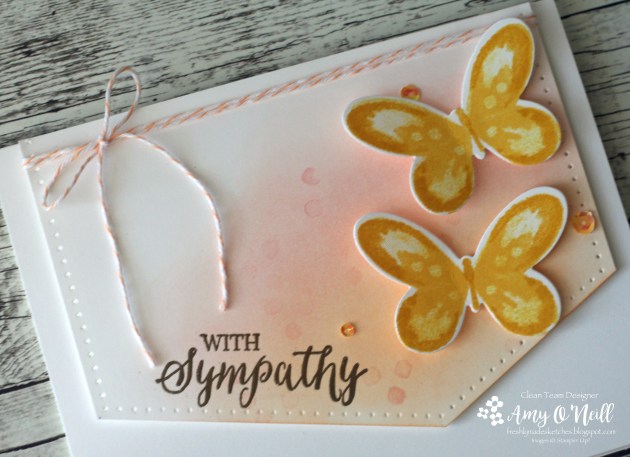 I started by sponging the top panel with some Powder Pink and Peekaboo Peach inks. The butterflies were stamped with Daffodil Delight and Crushed Curry inks. Some pretty iridescent sequins and Peekaboo Peach baker’s twine were added as well.
