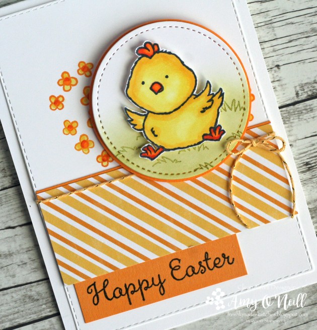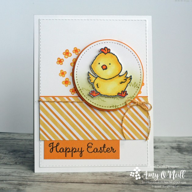 I started by stamping her on a piece of white card stock and coloring her with markers. I then cut her out with my paper snips. I cut out a stitched shapes circle and blended some Old Olive ink over the grass stamped images, and placed the little chick on it. The dsp is from the Birthday Bonanza dsp collection, and the sentiment was embossed on a piece of Mango Melody card stock.